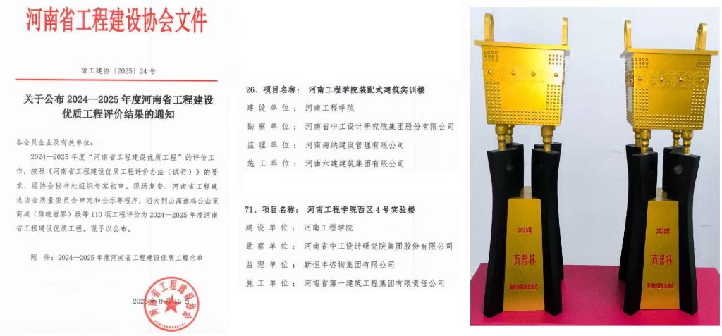 近日,学校基建工程捷报频传,西区4号实验楼与装配式建筑实训楼工程在获评2025年度“郑州市优质工程”奖(商鼎杯)的基础上,又同时获评2024-2025年度“河南省工程建设优质工程”奖。两项荣誉的取得,标志着学校在基建工程质量管理、技术创新和规范化建设方面已跻身全省前列,彰显了基建处团队的专业能力与责任担当。
