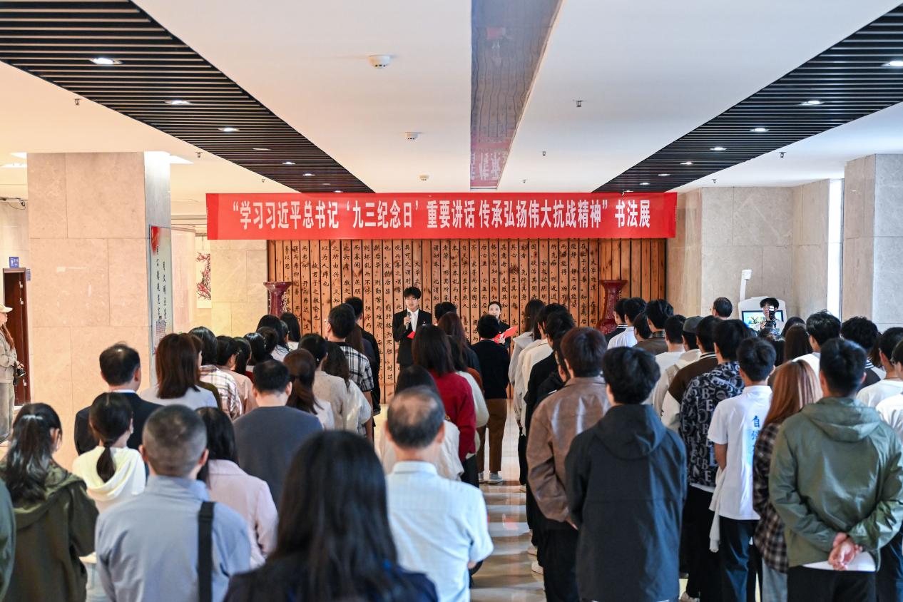 为深切缅怀革命先烈,弘扬伟大抗战精神,激励广大师生从历史中汲取前行力量,9月18日上午,由校工会主办,离退休工作处、校团委、书法协会承办的“学习习近平总书记‘九三纪念日’重要讲话,传承弘扬伟大抗战精神”书法展,在综合楼一楼举行开展仪式。原副校长孙国成,校党委副书记、工会主席赵红亮,相关职能部门负责人,龙湖校区各分工会代表及学生代表共计 120 余人齐聚现场,共同参与这一兼具文化底蕴与红色内涵的重要活动。