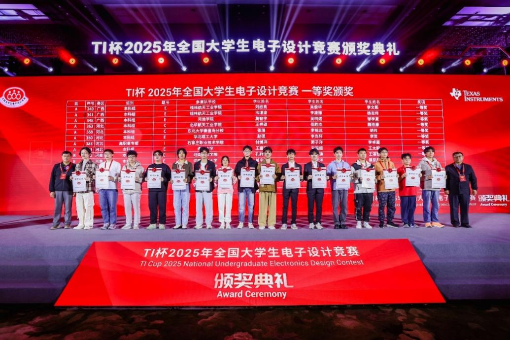 颁奖典礼现场嘉宾云集,全国大学生电子设计竞赛组委会主任管晓宏院士、西安交通大学党委副书记马博虎研究员、德州仪器中国区总裁姜寒先生等嘉宾出席并致辞。竞赛组委会主任管晓宏院士在颁奖致辞中强调:“学科竞赛通过真实项目驱动,有效弥合了理论教学与产业需求的鸿沟,是培养新时代创新型人才的关键抓手”。与会嘉宾对参赛学生的创新能力给予高度评价,并强调了竞赛在推动产教融合、促进创新人才培养方面的重要作用。在隆重的颁奖环节,我院师生代表与全国各赛区获奖师生共同接受了表彰,并在会议现场留影纪念。