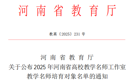 近日,河南省教育厅发布《关于公布2025年度河南省高校教学名师工作室教学名师培育对象名单的通知》(教高〔2025〕231号),beat365官网张珺教授入选2025年河南省高校教学名师工作室教学名师培育对象。全省高校共有50位教师获此荣誉称号。
