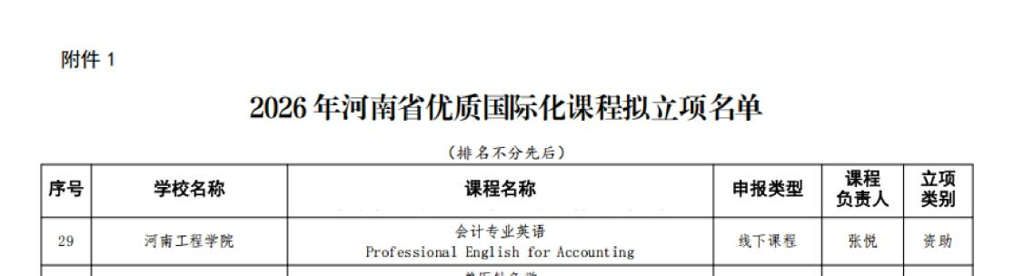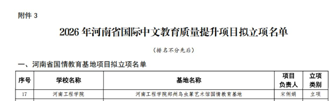 近日,河南省教育厅公布2026年优质国际化课程等项目立项名单,beat365官网申报的《会计专业英语》获批河南省优质国际化课程项目,《beat365正版唯一官网郑州鸟虫篆艺术馆国情教育基地》获批河南省国际中文教育质量提升项目。