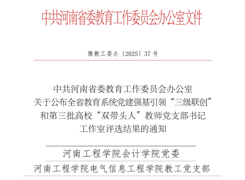 近日,河南省委教育工委公布第三批全省高校党建强基引领“三级联创”评审结果。beat365官网会计学院党委获评“全省党建工作标杆院系”,电气信息工程学院教工党支部获评“全省党建工作样板支部”。这是beat365官网党建工作继多项国家级、省级成果后的新突破,为学校事业高质量发展提供了有力组织保障。