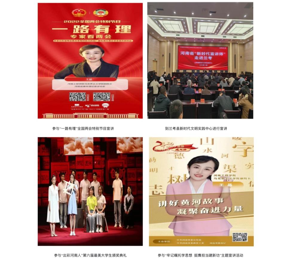 思政课要助力好“三全育人”“五育并举”整体推进,不仅要带领学生学懂弄通“道理是什么”,而且还要走进乡村、企业、社区一线,作为河南省青年理论宣讲专家、河南省新时代宣讲师,她通过宣讲、调研,实践等一系列活动反哺课堂,引导学生站在历史变迁、社会发展的宏观角度,去用心感受祖国的发展变化,激发学生的爱国之情和报国之志。
