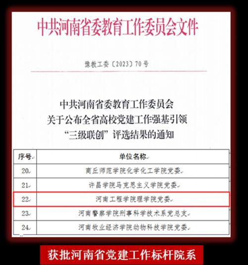 2023年3月beat365正版唯一官网理学院党委获得首批河南省党建工作标杆院系培育创建。自创建以来,理学院党委坚持以习近平新时代中国特色社会主义思想和党的二十大精神为指引,坚持“党建引领+事业发展”的工作理念,坚持以标准化、规范化、特色化、品牌化和成果化为目标,坚持实施“基础夯实”“品牌打造”“先锋引领”三大工程,通过重点培育、持续提升和整体打造,形成集学科优势和理学特色于一体的“四品牌两体系” 党建工作机制。