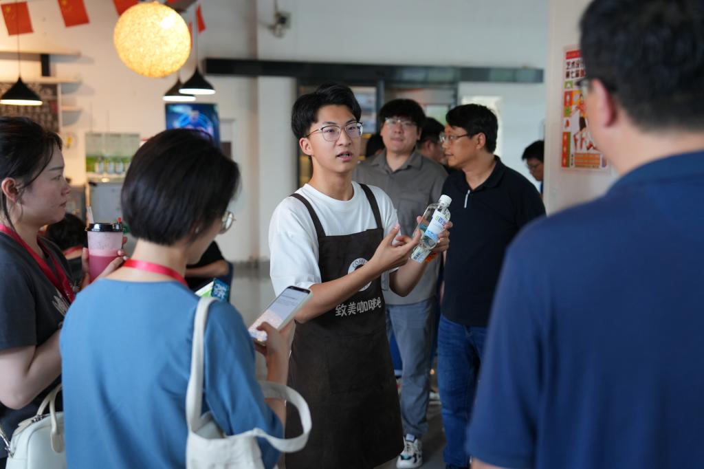 “这是我们4月份刚刚研发出的冷泡茶,用的是弱碱性强一点的山泉水,冷泡更好喝,上边的茶叶还可拆卸,适配市面上大多数饮料的瓶口。”冷泡茶研发者、数字媒体艺术22级学生袁彬向采访团介绍,目前该款冷泡茶已经投入校园,之后将投入校外市场。