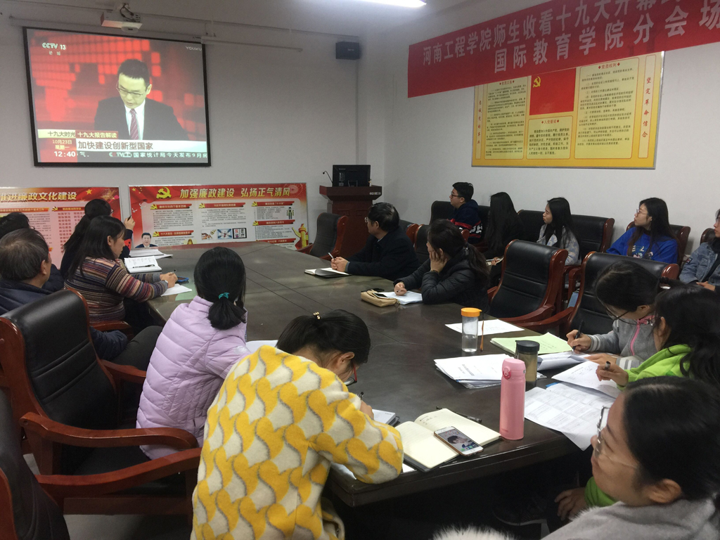 为了深刻学习领会党的十九大精神,了解党的十八大以来党和国家事业发生的历史性变革和取得的巨大成就,11月22日下午,国际教育学院召开党的十九大会议精神专题学习研讨会,并组织全体教师和学生代表集中观看专题片《创新驱动,中国渐成“世界创新工场”》。