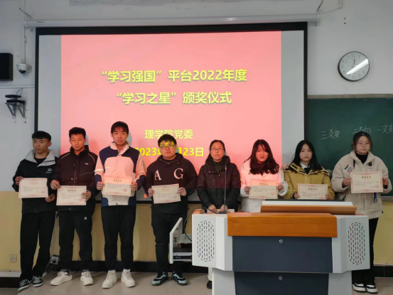 为树立榜样、表彰先进,进一步激发全体党员在“学习强国”平台的学习热情,形成比学赶超、以学促干的浓厚氛围,2月22日、23日,理学院组织开展了“学习强国”平台年度“学习之星”颁奖仪式,分别对2022年度学习强国总积分在本支部排名前20%的党员颁发荣誉证书。
