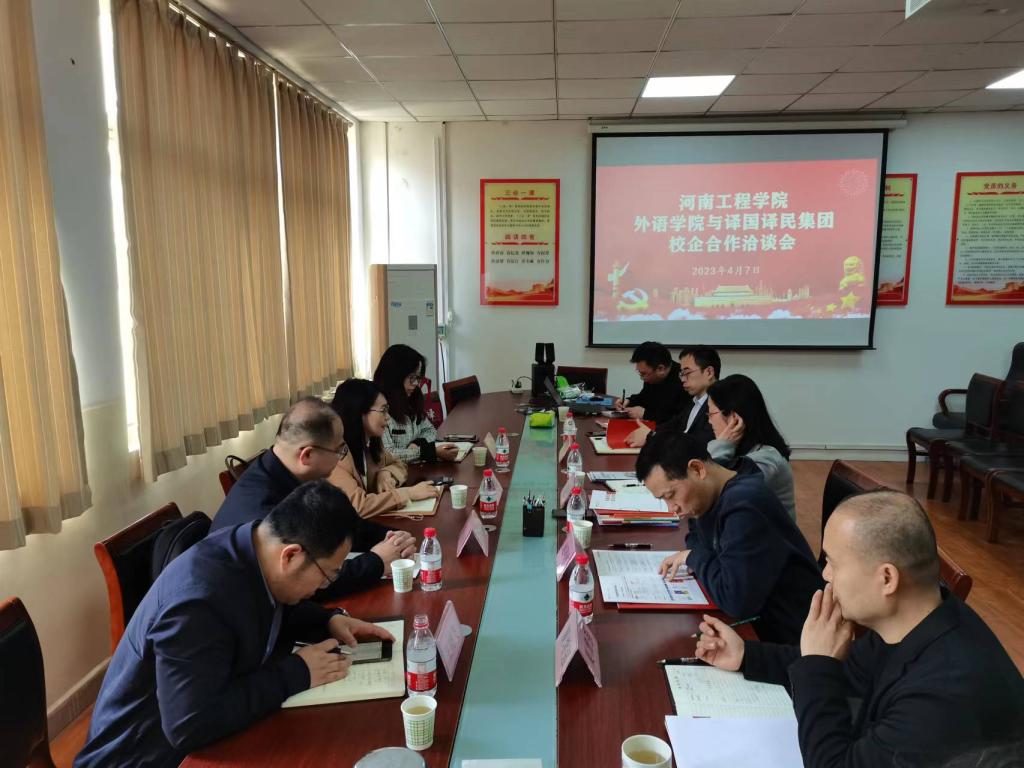 4月7日上午,译国译民集团雷良琼总经理、高校事业部总经理郑莺、大客户经理蔡安福、华北区总监王晓飞一行4人受邀来到外语学院洽谈校企合作推进事宜。外语学院部分领导及各专业系主任参加了此次洽谈会。