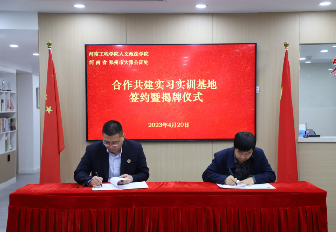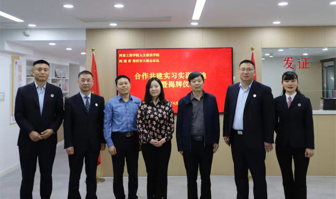 4月20日下午,人文政法学院校外实习基地签约暨揭牌仪式在郑州市大豫公证处举行。院长徐金超、法学系主任郭俊、法学系教师王银行出席仪式,大豫公证处主任李强、党支部委员宋琼、高级公证员闫巍参加仪式。仪式由大豫公证处副主任王家立主持。