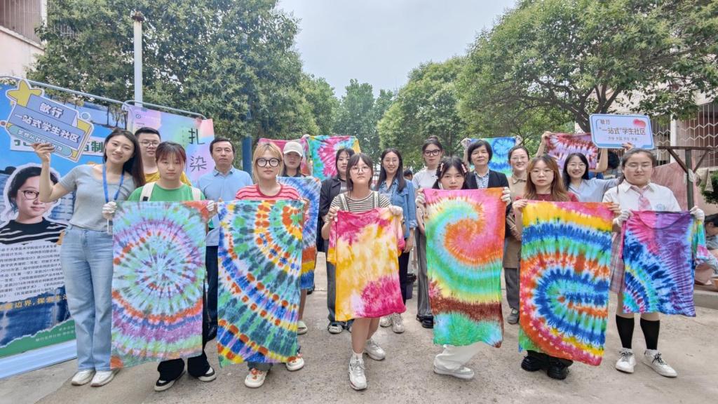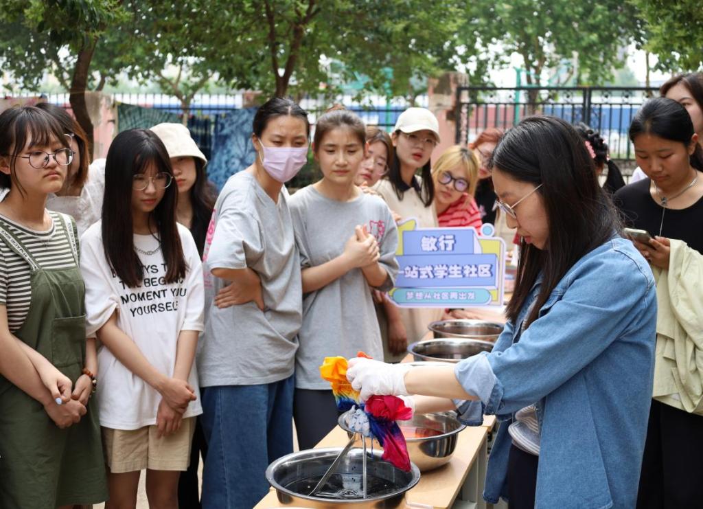 为弘扬中华民族优秀传统文化,增强大学生的文化自觉和文化自信,5月31日下午,敏行“一站式”学生社区联合艺术设计学院在西区慧苑3号、4号楼庭院组织开展“以巧手拓印万象 用心灵创意扎染”创意手工扎染沉浸式活动。活动邀请艺术设计学院有雯雯老师现场教学指导,敏行“一站式”学生社区育人导师及西区50余名学生参加活动。