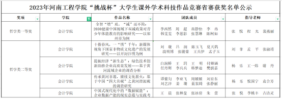 近日,喜讯传来,由共青团河南省委、河南省教育厅、河南省社会科学院、河南省科学技术协会、河南省学生联合会共同举办的第十六届“挑战杯”河南省大学生课外学术科技作品竞赛获奖作品公布,会计学院参加省级决赛的5个作品全部获奖,获得一等奖1项、二等奖4项,为学院赢得了荣誉。