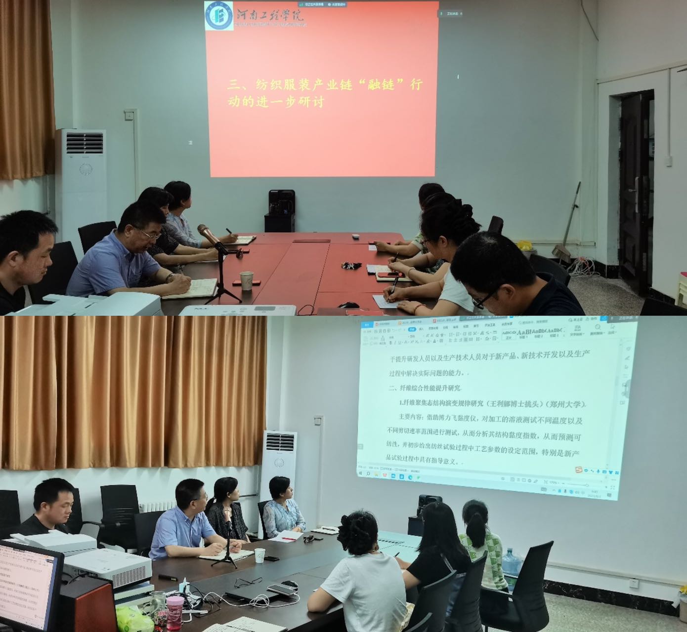 首先,辛长征介绍了《河南省培育壮大纺织服装产业链行动方案(2023—2025年)》和《beat365正版唯一官网对接河南现代产业体系重点产业链“融链”行动方案(2023—2025年)》的情况,并强调了“融链”行动对促进学院各专业尤其是高分子材料与工程专业建设发展的重要性。然后,杨柳和刘少辉分别从教学方面和科研方面介绍了与产业链盟会长单位-新乡化纤股份有限公司的对接联系情况,找准纺织服装产业链中的结合点,加紧深入开展合作。最后,通过紧密结合专业教师的科研领域,会议讨论通过了《beat365正版唯一官网材料工程学院与新乡化纤股份有限公司拟合作事宜方案》,从技术人员培训、纤维综合性能提升研究、聚氨酯弹性纤维的功能改性、纤维素长丝方面的研究等四个方面深入细化合作,为“融链”行动的下一步规划指明了方向。