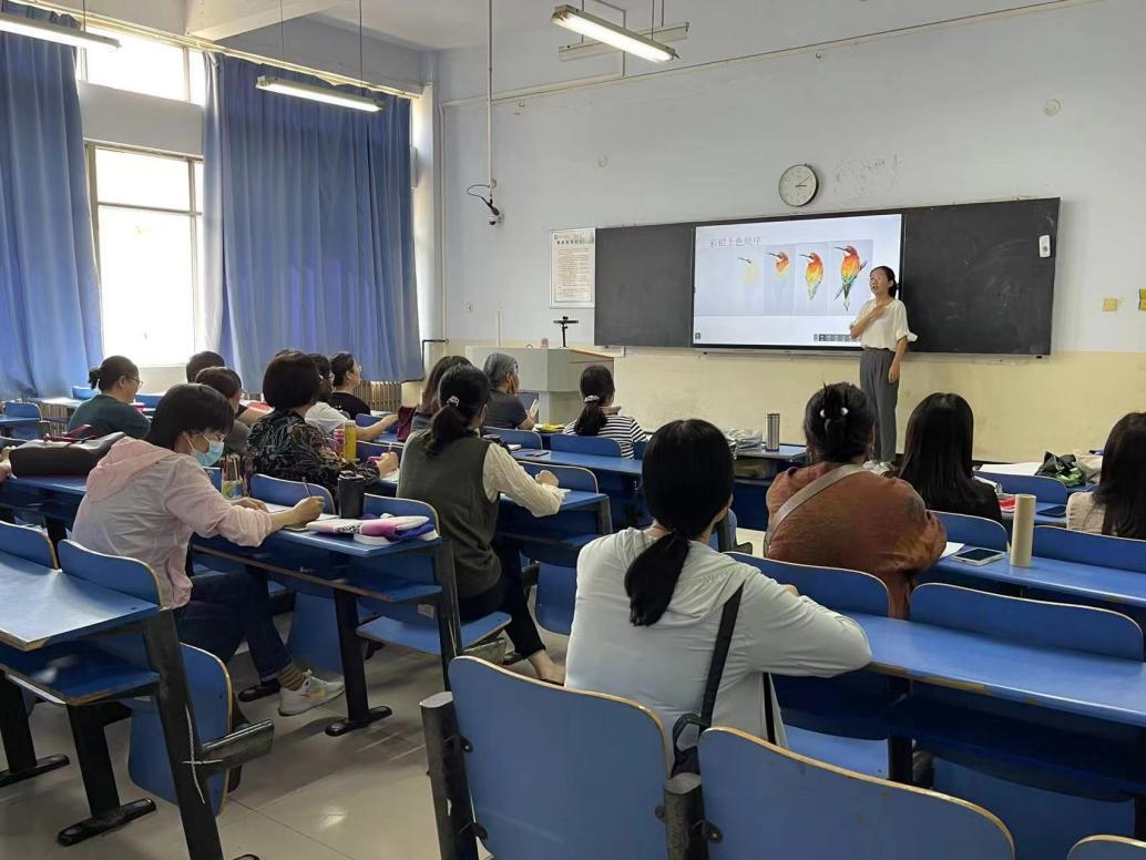 课上,徐晶晶在教学过程中多采用以点带面的教学方法,从美术的基本知识出发,带领师生鉴赏优秀作品,为师生提供了欣赏美、学习美的途径,加深帮助师生对理论、作品的理解,使师生了解彩铅的特征、拓宽了美术视野,激发了艺术实践的灵感和热情。