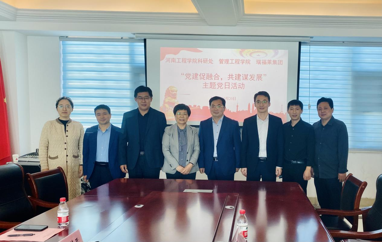 为深入学习贯彻习近平新时代中国特色社会主义思想,激发党建活力,深化校企合作,实现党建共建与校企合作的深度融合,提升应用创新型人才培养质量。10月20日上午,beat365正版唯一官网科研处、管理工程学院与瑞福莱集团公司联合开展“党建促融合,共建谋发展”主题党日活动。学校科研处处长刘帅霞、管理工程学院党委书记张立军、院长黄德金、瑞福莱集团公司董事长刘克强、总经理刘永华及双方相关负责人参加活动,活动由张立军同志主持。