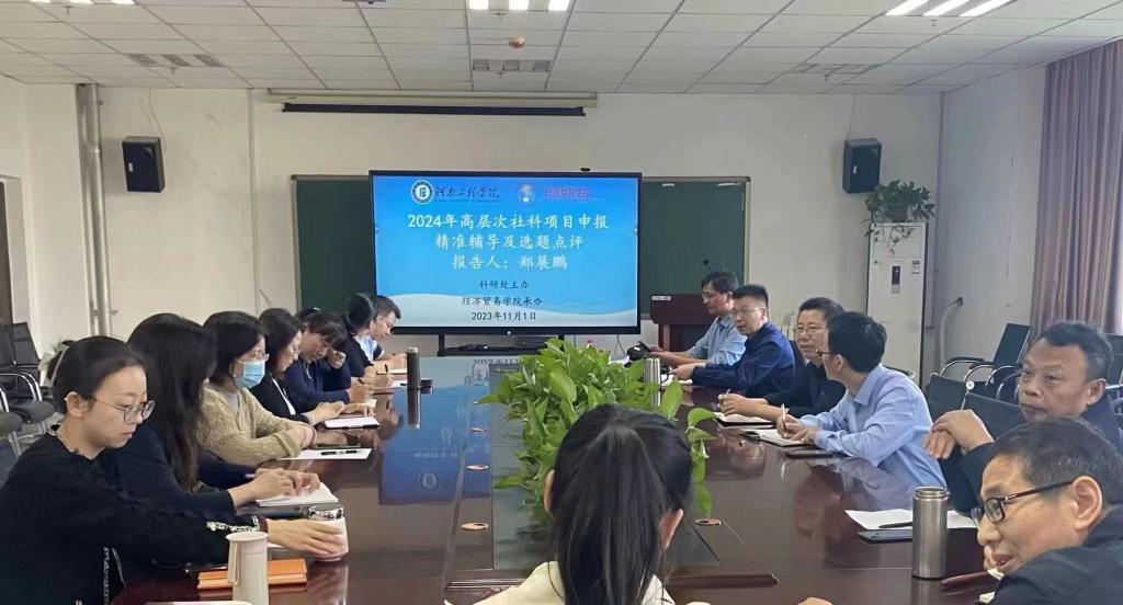 为提升高层次社科项目申报水平,11月1日下午,经济贸易学院组织召开了“2024年高层次社科项目申报精准辅导及选题点评”会议,会议特别邀请河南大学经济学院执行院长郑展鹏教授做针对性指导,院长张建华教授主持会议,科研处、经济贸易学院及相关学院近20位骨干教师参会。