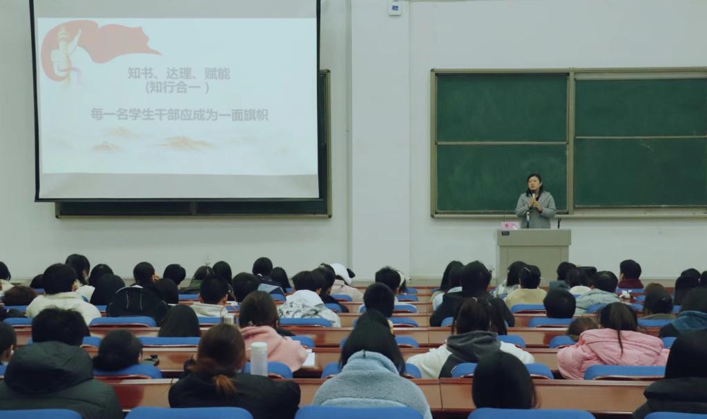 讲座中,黄玉强调学生干部和学生党员要走好新时代长征路,努力成为一面旗帜。一是赋能成长成才,做社会主义建设者和接班人。要勤学,下苦功夫,求真学问,将知书、达理、赋能三者结合起来,做到知行合一、以知促行、以行求知,在新时代做出一番事业。二是强化责任担当,做伟大时代的奋斗者和扛旗人。要加强道德修养,注重道德实践,善于明辨是非,善于决断选择,主动作为,扎实干事,为全面建设社会主义现代化国家而努力奋斗。三是厚植家国情怀,做中华民族伟大复兴的参与者和见证人。要增强“四个意识”、坚定“四个自信”、做到“两个维护”, 铸牢中华民族共同体意识,苦干实干,在实现伟大梦想的生动实践中书写精彩人生。