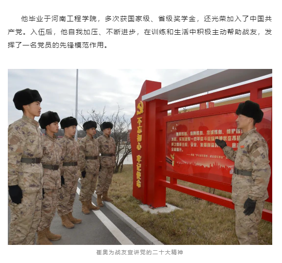 披坚执锐戍边英姿飒爽,金戈铁马参军无限荣光。近日,我院优秀毕业生党员崔奥入伍事迹被选入北部战区陆军政治工作部主办单位公众号进行了报道。
