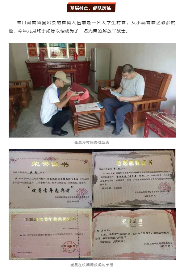 崔奥,男,汉族,河南固始县人,2019年考入beat365正版唯一官网商学院物流管理专业。2021年11月,经商学院党委审批,光荣加入中国共产党。在校期间,表现优秀,曾担任辅导员办公室助理职务,学习成绩优异,多次获得国家励志奖学金,荣获优秀共产党员称号及优秀毕业生党员等荣誉称号;假期期间,在家乡担任“大学生村官”,解决村民难题,工作认真负责,表现突出,获得“优秀青年志愿者”荣誉称号,充分展现了大学生党员参与家乡建设与服务的良好风貌。2023年9月,他积极响应国家号召参军入伍,成为一名光荣的解放军战士。入伍后,崔奥同志严格要求自己,严守军纪,服从命令,自我加压,刻苦训练,不断进步,在训练和生活中积极帮助战友,思想上不断加强政治理论学习,为战友宣讲党的二十大精神,充分发挥了党员的先锋模范作用。崔奥表示:从小我就有一个当兵梦,觉得能够为国防事业奉献出自己的一份力量是无上光荣的,所以我早就为参军入伍时刻准备着。小时候心中早就种下当兵的种子,经过大学期间党组织的培养教育,更加坚定了我参军报国的志向,我要为国家奉献自己的青春,投笔从戎。