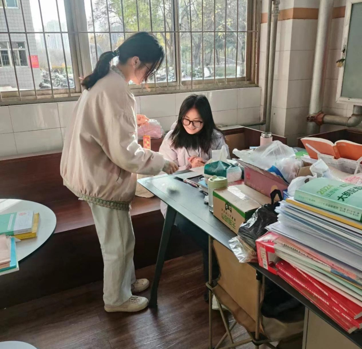 活动结束之后,志愿者们前往南区8号楼和7号楼,纷纷把手作的小柿子和祝福明信片送给考研学子们,温馨的嘱托和寓意满满的考研加油包,不仅让考研学子真切地感受到学院的关怀和祝福,也愈加坚定了他们的信心和决心。