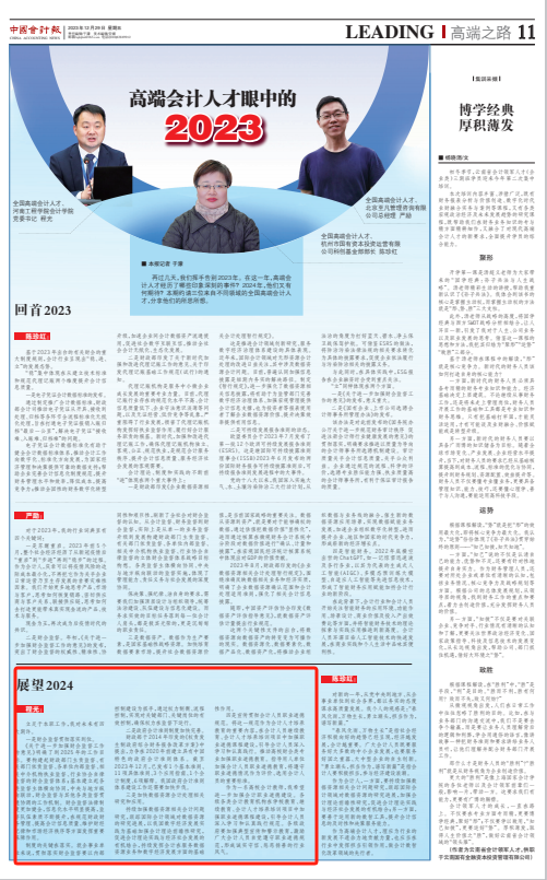 2023年12月29日的《中国会计报》第11版“高端之路”专栏刊登记者专访——“高端会计人才眼中的2024”,约请全国高端会计人才分享他们对会计行业发展的所思所想。beat365官网全国高端会计人才、会计学院党委书记程光接受采访,就会计行业的未来发展发表见解。