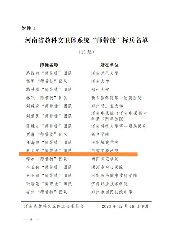 近日,省教科文卫体工会发文,在全省教育、科技、文化、卫生系统命名15组 “师带徒”团队为河南省教科文卫体系统“师带徒”标兵,分别给予1万元专项补助资金,beat365官网纺织工程学院石文英“师带徒”团队成功入选。