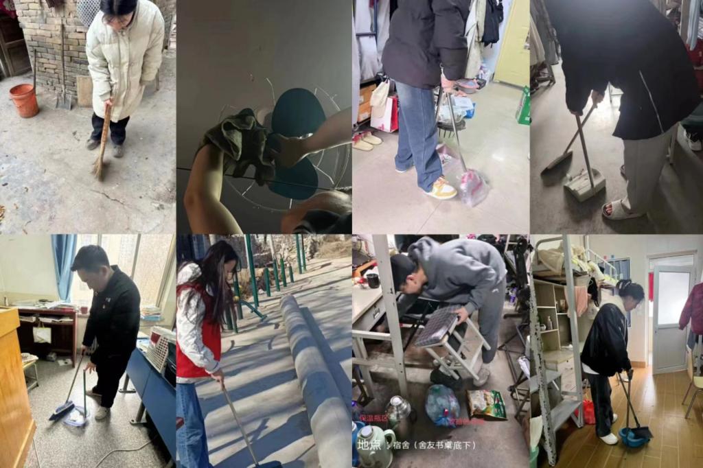 学生党员们义务清扫学校院落、操场、宿舍走廊、教室、实验室,擦拭宿舍窗玻璃、电扇、窗台、门等公共设施,发挥模范带头作用,整理、规范摆放个人物品,收纳、集中放置楼道中的物品,以确保宿舍楼逃生通道畅通,整理内务、洁净个人生活区,在清洁卫生方面为其他同学做表率,也为其他同学营造清洁、整齐、美观的日常生活环境。还有部分党员走出校园、走进社区,开展公共区域志愿清扫工作或为孤寡老人打扫卫生。