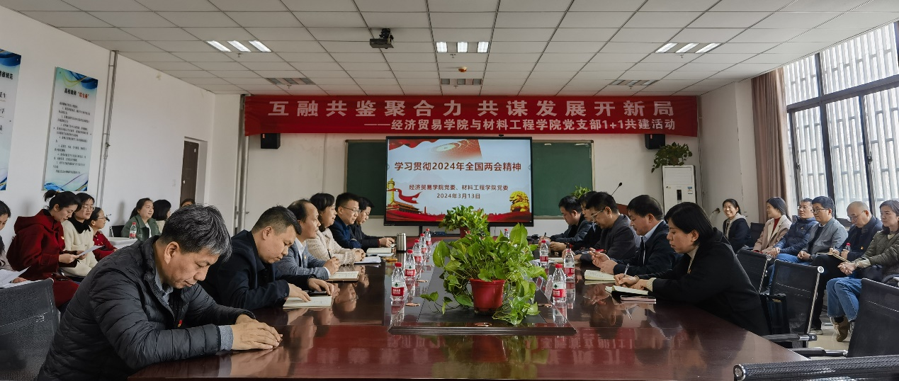 为深入学习贯彻2024年全国两会精神,进一步提高党员的思想政治素质和建功新时代的责任担当,不断推动支部工作的创新发展,3月13日下午,经济贸易学院党委联合材料工程学院党委在九号楼三楼会议室开展党支部1+1联学联做党日活动,两个学院的教工党员参加了本次活动。