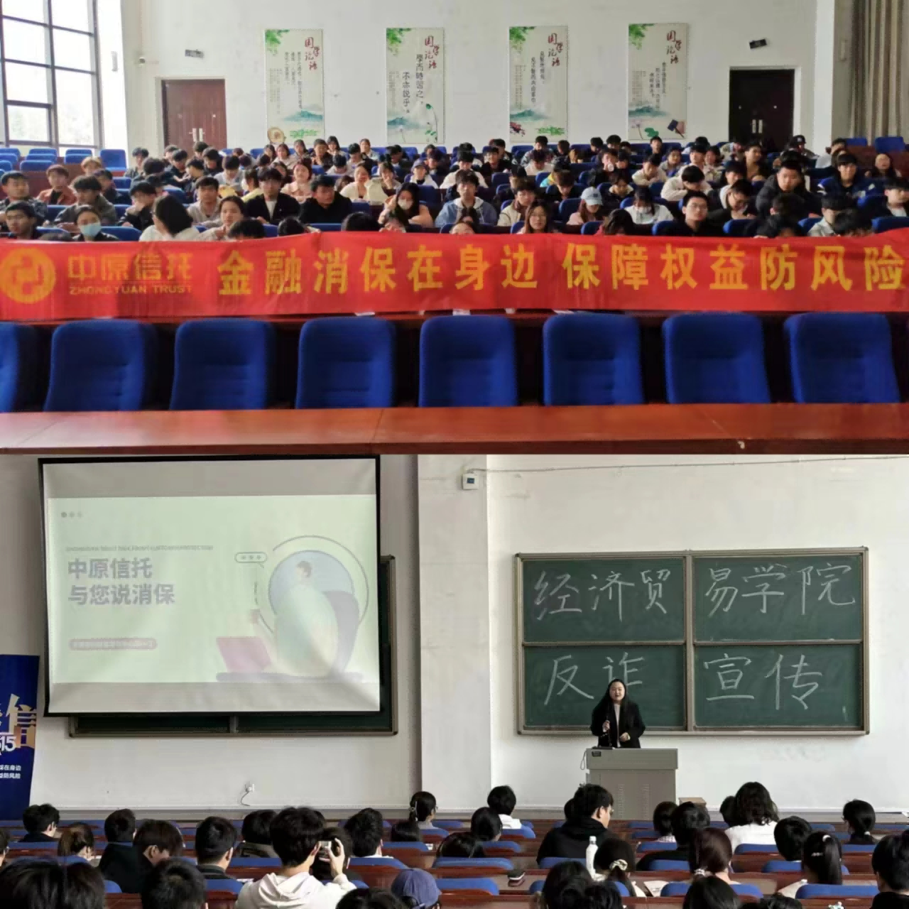 为全力预防和遏制电信网络诈骗案件在校园的发生,3月13日下午,经济贸易学院特别邀请中原信托财富管理中心来校在9A227国学大讲堂开展了金融反诈骗专项教育宣传,学院2023级全体学生参加了宣讲活动。