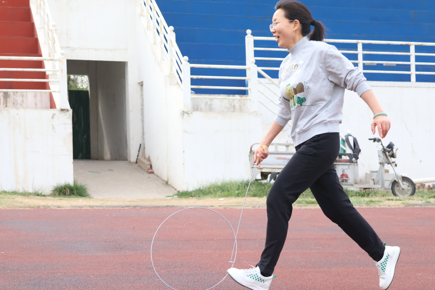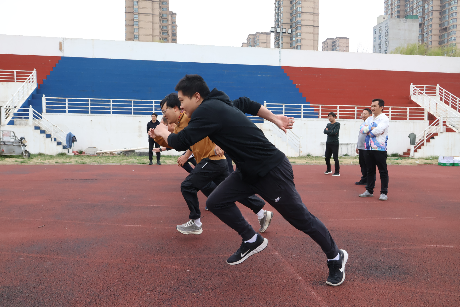 本次教职工运动会既设有100米跑、铅球、跳远、4×100接力等体育竞技类项目,也有多人跳大绳、乒乓球托球接力、趣味保龄球、滚铁环等趣味类项目。简单的开幕式结束以后,比赛就陆续开始了。运动员们本着“友谊第一,比赛第二”的精神,顽强拼搏,奋勇争先,展现了良好的精神风貌。赛场上,欢呼声、助威声此起彼伏,现场气氛热烈而欢快。跳大绳、滚铁环等趣味项目让大家仿佛回到了青春年少。运动员们充分发扬顽强拼搏、团结合作的精神,尽情享受趣味体育竞技带来的快乐。