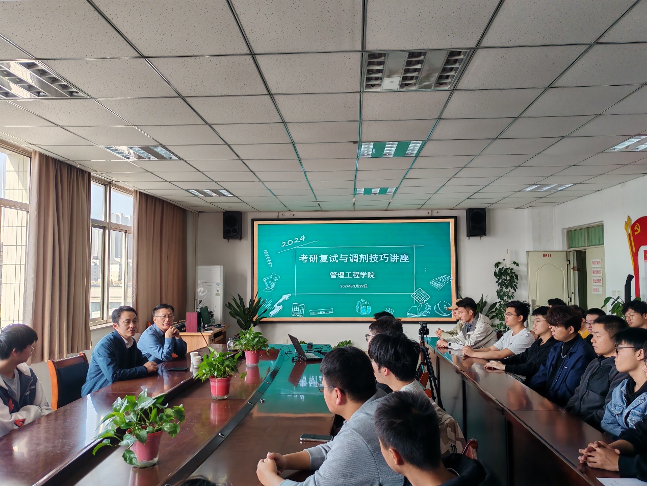 为帮助考研学生熟悉复试与调剂流程,助推考研学生成功上岸,3月29日上午,管理工程学院在学院会议室举办2024届考研复试与调剂指导讲座,邀请中原工学院经济管理学院副院长黄新春副教授主讲,会议采用线下线上结合方式进行,本届考研上线考生参加讲座,院长黄德金主持讲座。