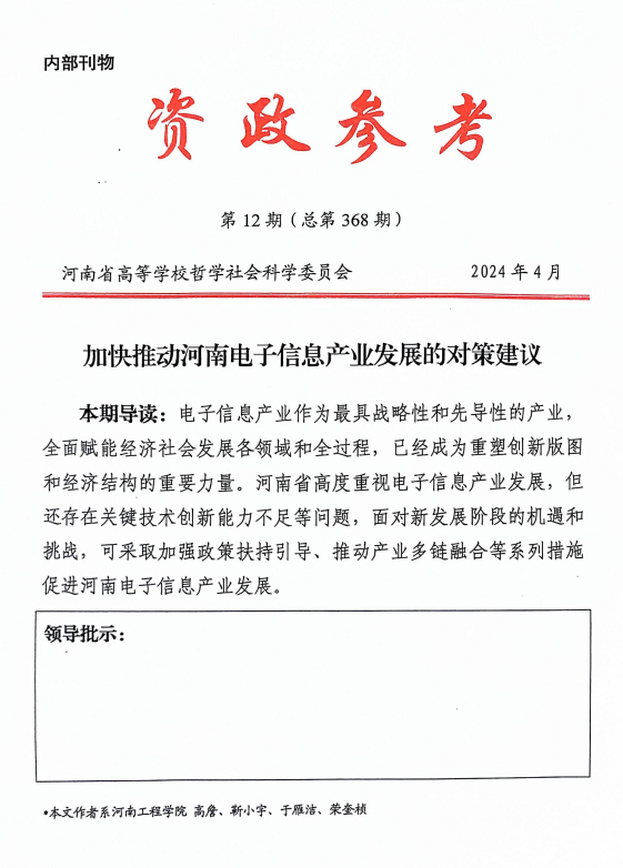 河南省《资政参考》第12期(总第368期)于2024年4月刊发了beat365官网新型高校智库“中原经济和社会高质量发展研究中心”成员、商学院高詹教授团队撰写的议政性研究报告《加快推动河南电子信息产业发展的对策建议》。
