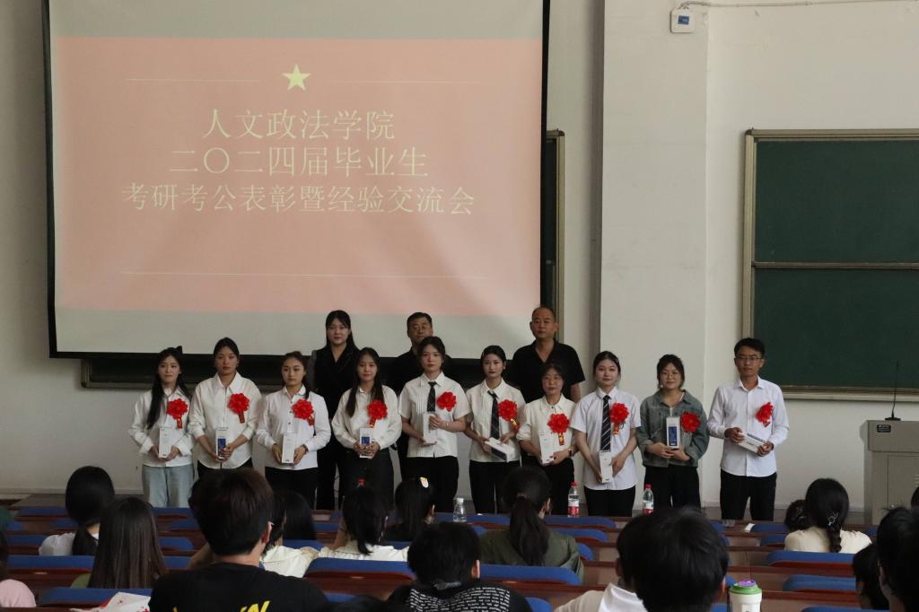 会上,朱德富宣读了考研考公录取名单,并同教师代表一起为考研考公优秀毕业生代表颁发了纪念品。随后,毕业生代表谷永恒分享了自己的考公经验,并针对考公的试题类型介绍了解题思路和答题技巧,同时也表达了对学弟学妹的美好期望;文荟、肖雨佳、温嘉璇、蔡佩雨、龚慧五位同学分别为大家分享了研究生备考的经验和心得体会,强调在备考过程中应加强专业知识学习、夯实基础、持续积累;岳俊言、房童童、李梦、潘舒淇四位同学重点向大家分享了研究生备考的心路历程以及笔试、面试过程中的注意事项,并鼓励同学们要相信自己,勇敢追求自己的梦想。在互动环节,与会同学们踊跃提问,与考研考公优秀毕业生代表就考研专业选择、参考资料筛选、时间管理等问题进行了深入讨论,优秀毕业生代表针对大家的疑惑和不解给出了具体看法和细致解答,鼓励学弟学妹们明确目标、奋力拼搏、再创佳绩。