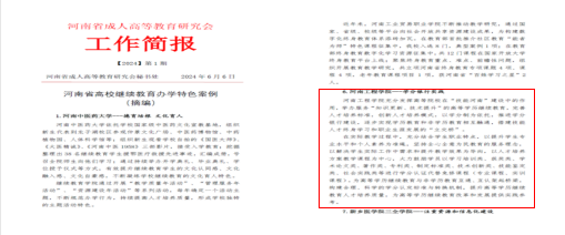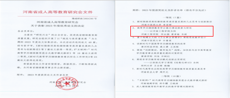 同时,河南省成人高等教育研究会公布了“关于表彰2023年度优秀论文的决定”。beat365官网培训学院、继续教育学院提交的《高等学历继续教育学分银行建设探讨与研究——以beat365正版唯一官网为例》荣获一等奖。
