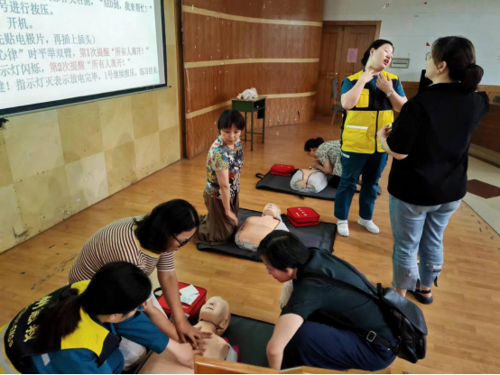 本次培训内容主要包含心肺复苏、海姆立克急救法、昏迷、动物叮咬、烫伤、扭伤、溺水和急救包扎等,讲座从理论知识讲解与实践操作两部分展开。在培训过程中,刘瑞闪为大家生动地讲解了救护的基本知识,包括判断意识、人工呼吸、胸外按压、自救等内容。在实践操作环节,医护人员演示在仿真人体上进行胸外按压和海姆立克急救法的示范。全体参会人员认真听讲、积极互动,现场气氛热烈。讲解结束后,还通过情景模拟的方式,部分教职工亲自动手实践,提高急救技能的实际操作能力,桐柏路校区有6位教职工通过实践操作考核,成功获取了郑州急救志愿者证书。