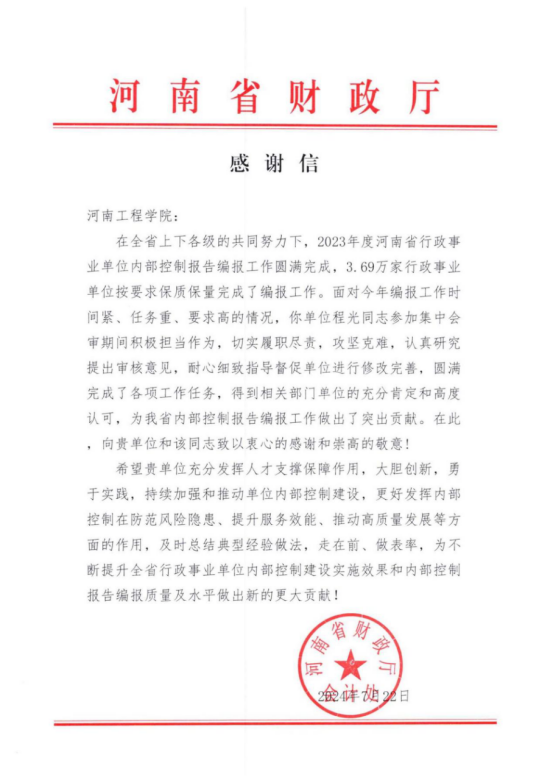 近日,beat365官网收到河南省财政厅会计处发来的感谢信,感谢会计学院程光同志在2023年度河南省行政事业单位内部控制报告会审过程中,积极担当作为,切实履职尽责,攻坚克难,认真研究提出审核意见,耐心细致指导督促单位进行修改完善,圆满完成了各项工作任务。程光同志的专业水平和敬业精神得到相关部门单位的充分肯定和高度认可,为我省内部控制报告编报工作做出了突出贡献。河南省财政厅会计处向beat365官网和程光同志致以衷心的感谢和崇高的敬意!