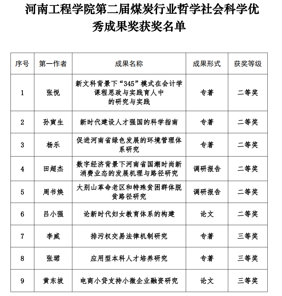 近日,中国煤炭教育协会公布了《关于公布第二届煤炭行业哲学社会科学优秀成果奖获奖项目的通知》,学校共有9项成果获评第二届煤炭行业哲学社会科学优秀成果奖获奖,其中二等奖6项,三等奖3项。
