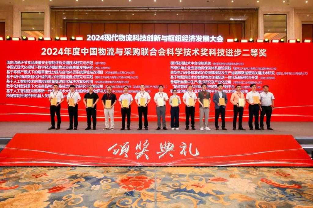 大会同期举办了2024年度物流领域345项科技创新及应用成果和28位科技创新先进人物的荣誉发布。商学院由高詹教授主持,与河南钧泰供应链管理有限公司、河南顺通供应链管理有限公司联合申报的研究成果《基于物联网技术的智慧物流仓储配送一体化系统研究与开发》荣获科技进步二等奖。