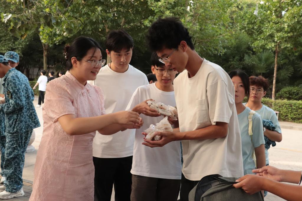 情暖中秋,聚力人文同心圆。中秋佳节当天,人文政法学院党委书记张莉、院长徐金超带领学工队伍深入新生宿舍,给新生同学们送去关心和关爱;学院党委副书记朱德富和新生辅导员吴胜男老师在三棵树为新生分发中秋月饼,和刚刚步入大学生活的学子们一起感受节日的温馨与快乐。新生们纷纷表示,中秋慰问活动让他们感受到了学院的真心、关心和爱心,他们有信心、有决心完成好军训任务,为即将开始的大学学习生活做好准备。