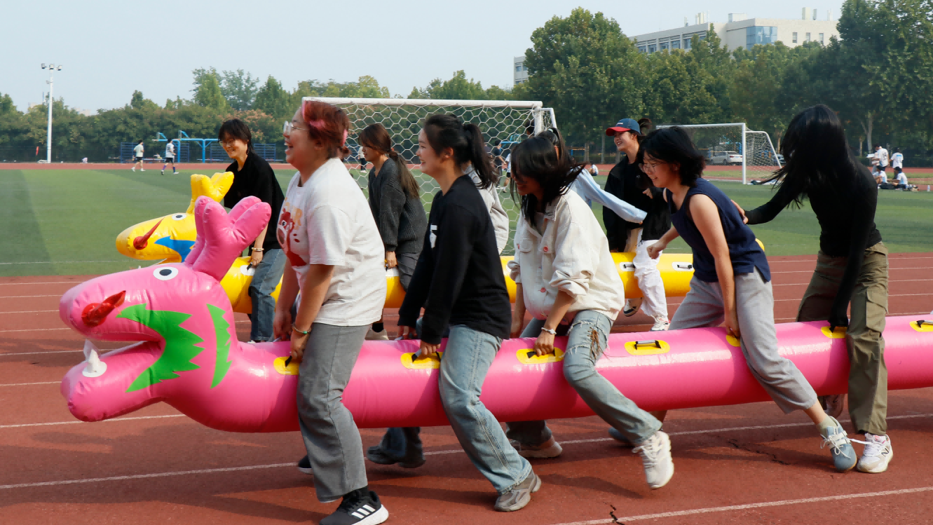 本次运动会设置了多项富有创意且兼具挑战性的比赛项目,包括疯狂毛毛虫、投掷沙包、蒙眼护打等考验团队配合能力的团体游戏。其中,“疯狂毛毛虫”模拟了传统龙舟的形式,但使用的是特制的充气船,不仅增加了比赛的趣味性,也锻炼了参赛队伍之间的默契程度;在“投掷沙包”活动中,队员们需要展现出良好的手眼协调能力和精准的投掷技术;而“蒙眼互打”则需要较强的反应能力和团队合作,既考验同学的交流合作又增添了乐趣。