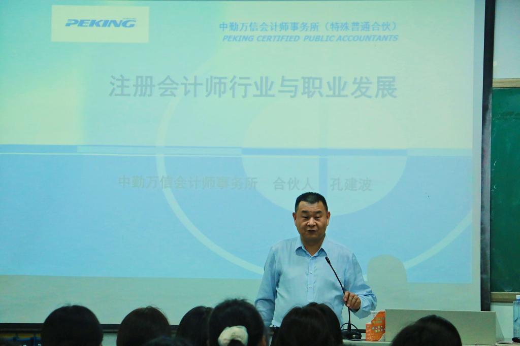 聘任仪式后,学院在8221教室举办职业发展讲座,学院教师李云、辅导员张浩清和会计学(注册会计师方向)2441、2442班全体同学参加,讲座由学院党委副书记张维主持。职业导师孔建波老师为注会两个班全体同学,做了一场题为《注册会计师行业与职业发展》的专题讲座,孔建波老师结合自己的从业实践,分别从“注册会计师行业现状及发展、大学生的职业发展和如何度过美好的大学时光”三个方面进行了深入讲解,并分享了自己的从业经验和学习生活的体会。讲座内容丰富,别开生面,对刚刚进入大学的学生来说,拓宽了知识视野,加深了职业实践认识。讲座引发了学生的强烈共鸣,在随后的交流环节中,同学们纷纷发言,结合孔老师所讲的内容,谈体会谈感悟、谈目标谈方向、谈人生谈学习,气氛真诚而热烈。