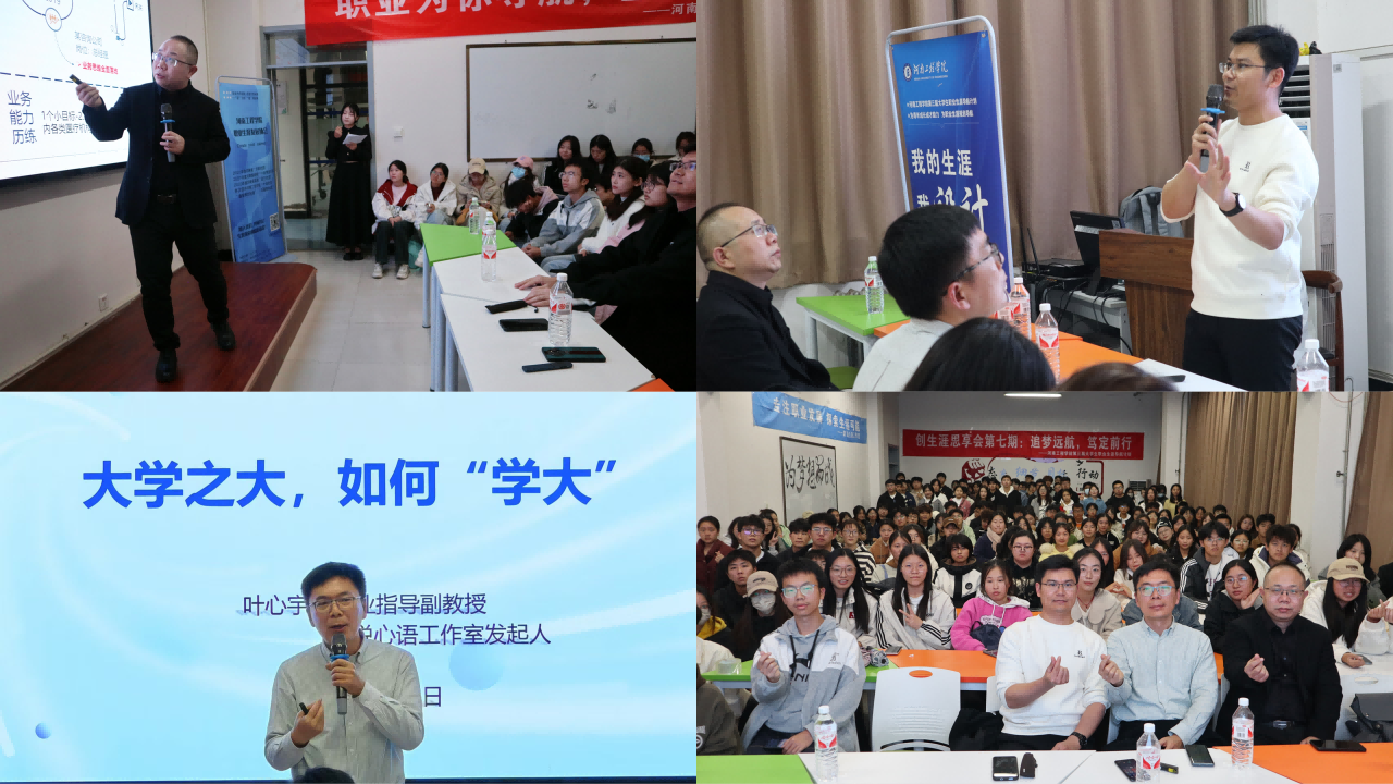 活动中还采用视频连线的方式邀约了三个优秀毕业生代表:张晨雨(任职于尉氏县委组织部,2019届毕业生)、李治杰(任职于中铁六局交通工程分公司天津地铁项目综合办,2020届毕业生)、王乾旭(华为技术有限公司高端招聘HR,2021届毕业生),分别从各自的定位与成长视角,为学弟学妹们分享其生涯经历和建议期待。叶心宇老师在最后总结时指出:“希望同学们不仅要重视规划和定位,更要重视行动和历练,让当下的选择和行动能够为高质量就业进行有针对准备。”