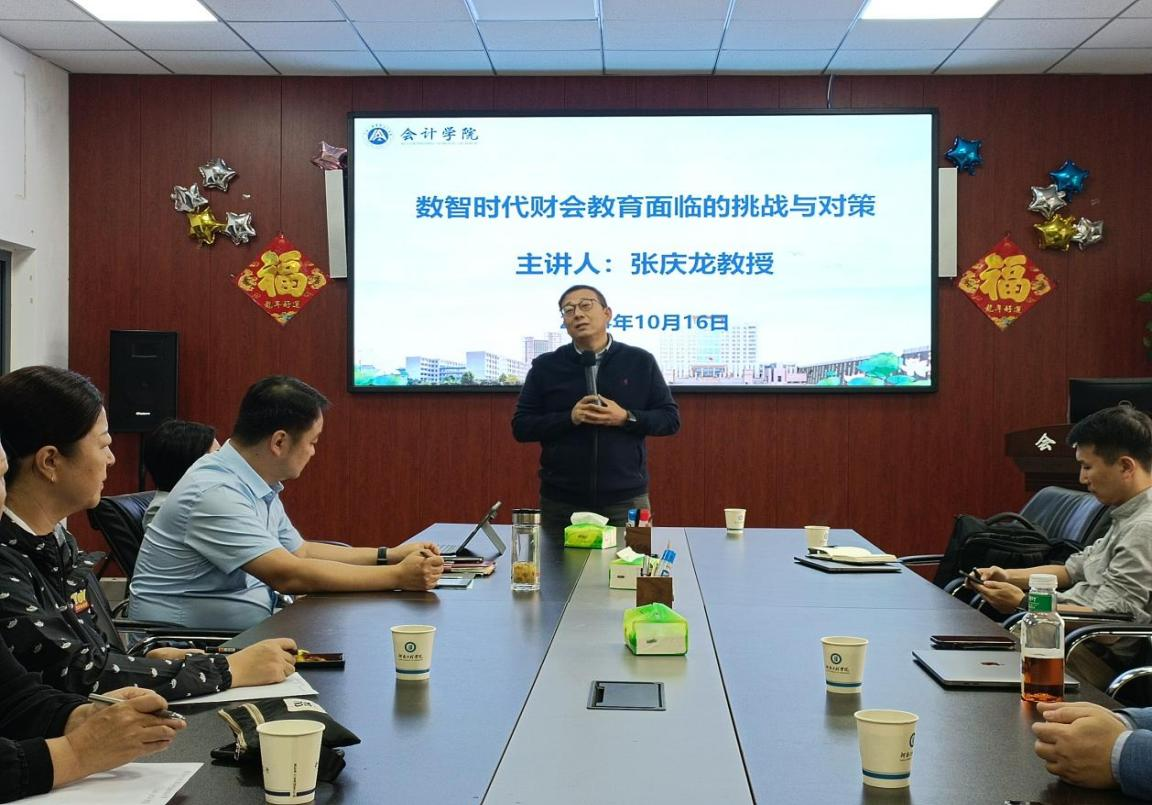 10月16日下午,中国财政科学研究院教授、博士生导师张庆龙一行五人到访会计学院开展学术交流。张庆龙为会计学院全体教师做了题为《数智时代财会教育面临的挑战与对策》的专题讲座。讲座由学院党委书记、院长程光主持。