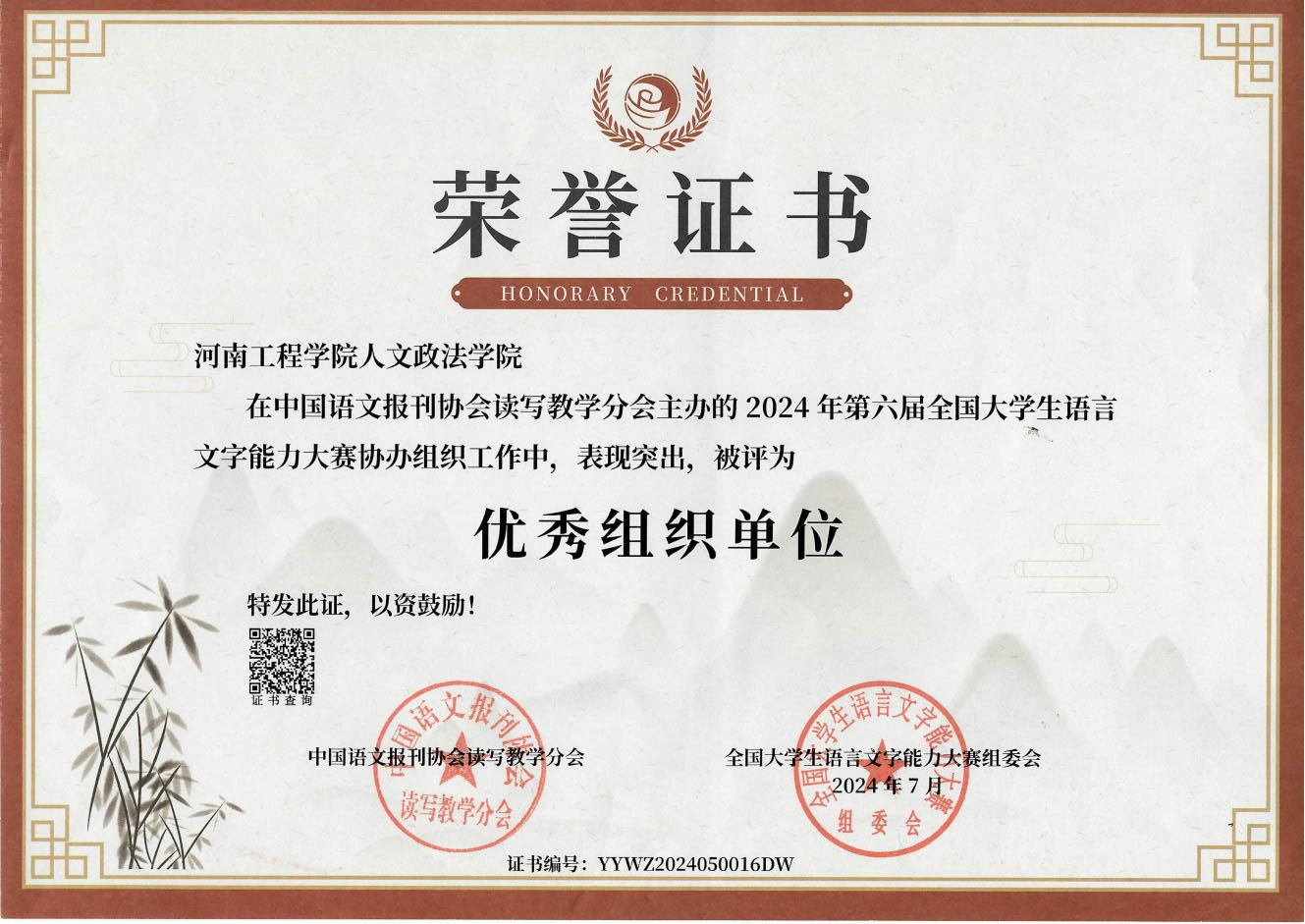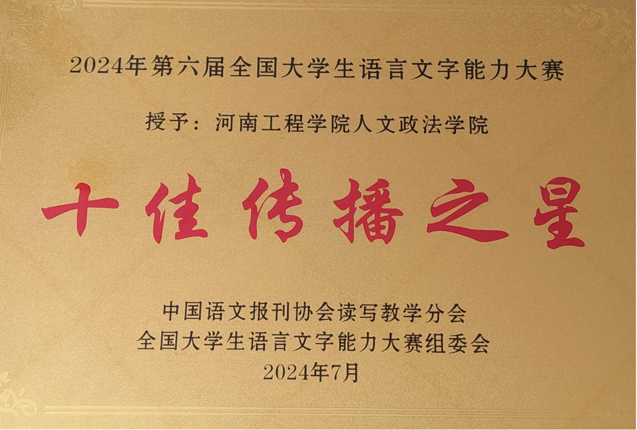 近日,由中国语文报刊协会读写教学分会主办的2024年第六届全国大学生语言文字能力大赛全国决赛成绩公示,标志着为时四个多月的全国大赛圆满落幕。作为本届大赛的协办单位,人文政法学院赛前积极组织全校学生报名参赛,赛中有序组织学生参赛,赛后对赛事全过程进行集中宣传报道,被中国语文报刊协会读写教学分会及全国大学生语言文字能力大赛组委会授予“优秀组织单位”及“十佳传播之星”荣誉称号。