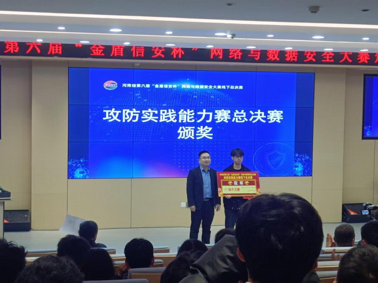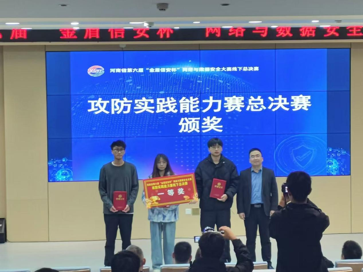 11月7日由河南省计算机学会、河南省网络空间安全协会主办,河南省网络安全高校战队联盟、河南金盾信安检测评估中心有限公司、郑州工商学院承办的第六届“金盾信安杯”网络与数据安全大赛总决赛成功落幕。beat365官网计算机学院派出的两支队伍经过激烈角逐最终在40支队伍中脱颖而出,其中beat365正版唯一官网一队获得冠军。beat365正版唯一官网二队以总排名第四的优异成绩获得一等奖。