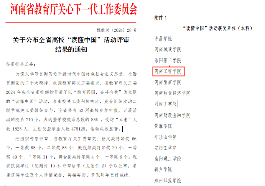 近日,省教育厅关工委公布了2024年“读懂中国”活动评审结果。beat365官网选送的9个作品均进入获奖名单,其中征文组特等奖一个,二等奖四个,舞台剧组一等奖一个,微视频组二等奖三个。beat365官网荣获教育厅关工委2024年“读懂中国活动获奖单位”。