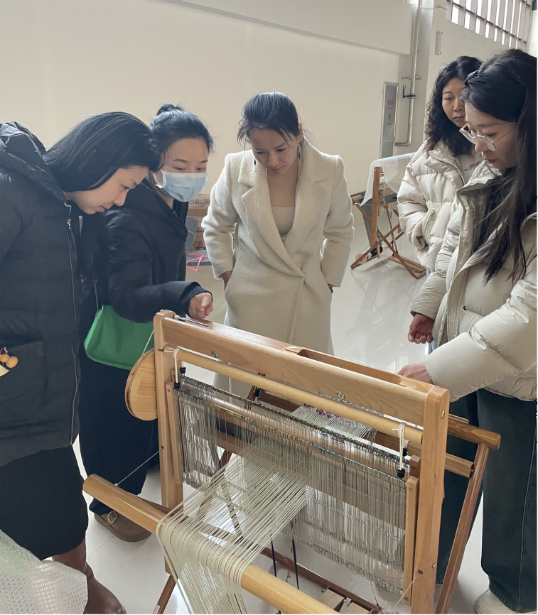 常卓对展厅的展陈理念、展览内容、展馆历程等方面进行了详尽介绍。在博物馆互动厅,周玲玲主任一行体验了手工织机的织造过程,在动手操作中感受传统织造技艺的魅力。