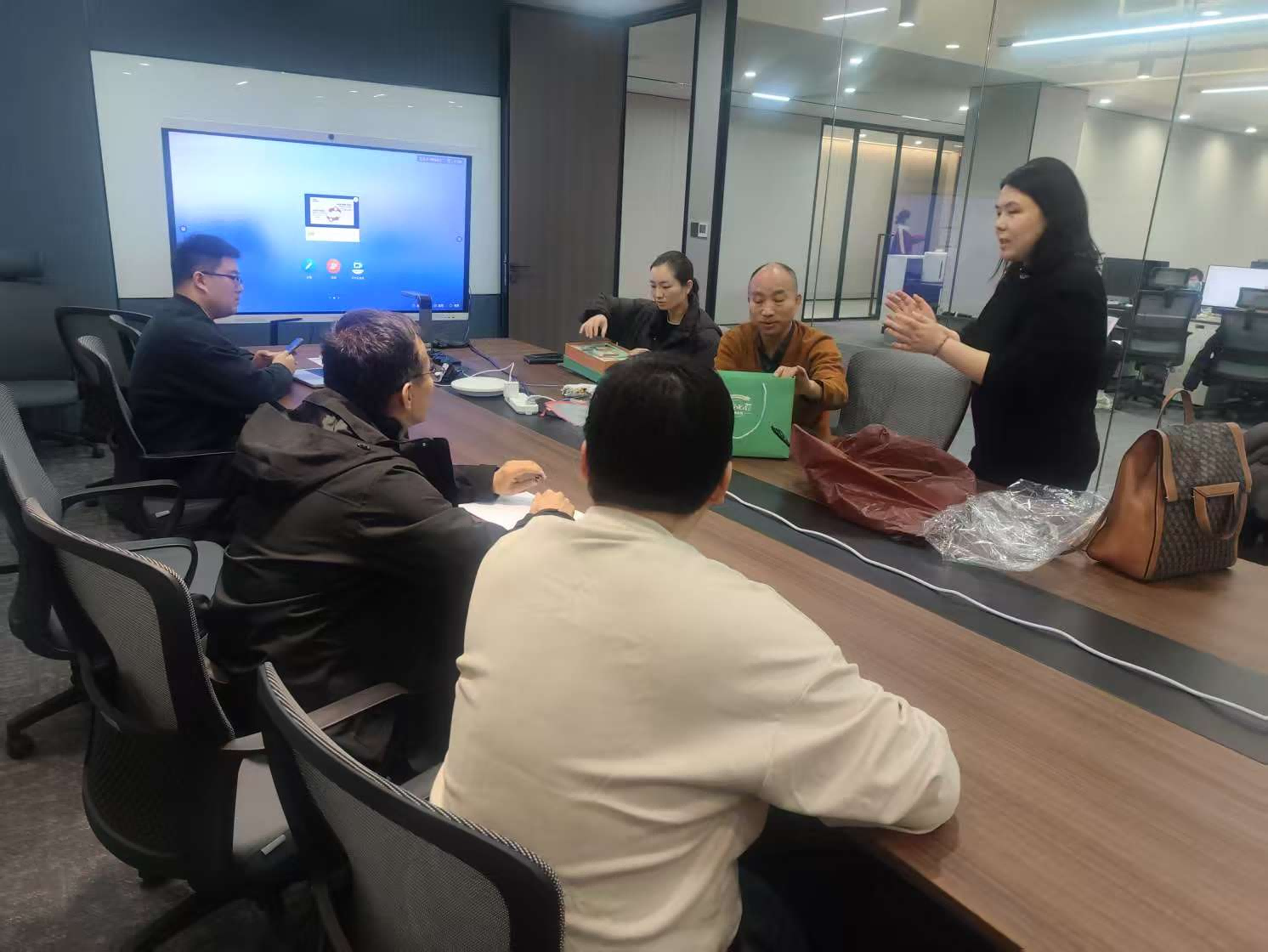交流座谈会上,朱明首先对公司的热情接待表示感谢,并介绍了学院在科研与社会服务方面的特色优势。朱明指出,在人工智能快速发展的时代,艺术与科技的融合是未来发展的必然趋势,希望通过此次考察学习,探索艺术设计在AI领域的创新应用,为双方在科研创新、社会服务和人才培养方面的合作找到切入点。