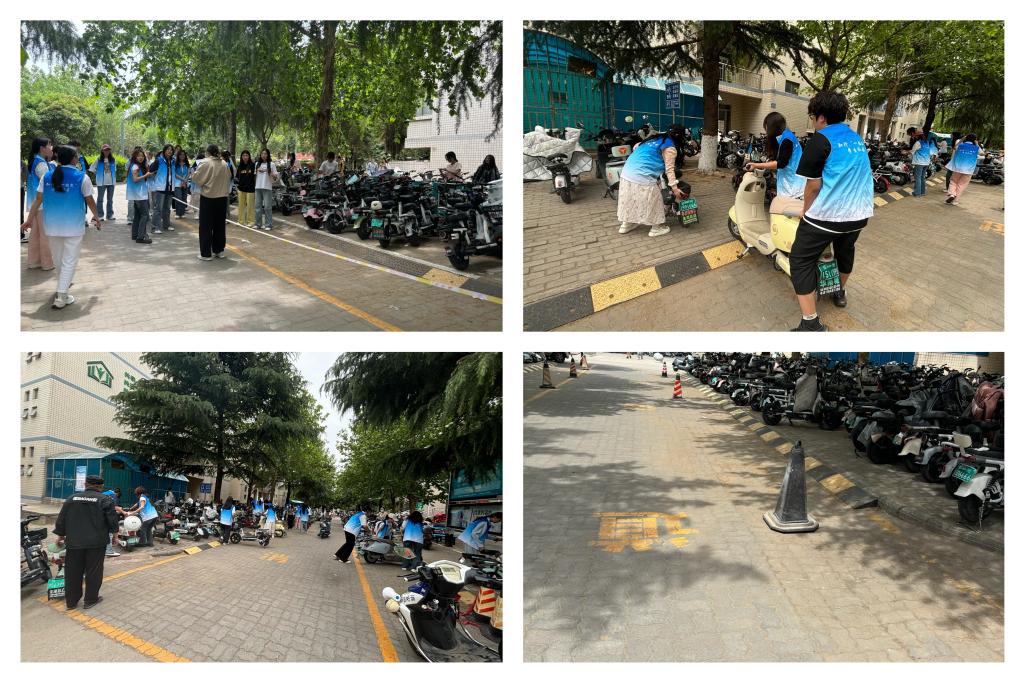 活动现场,在社区辅导员老师的精心组织下,志愿者们迅速集结,分为若干小组,对宿舍区周边的电动车密集停放区域展开了全面而细致的整治行动。他们深入宿舍楼下各个电动车停放区域,耐心引导同学们将电动车规范停放在合理区域,避免占用消防通道,并通过实际行动示范,帮助大家养成良好的停车习惯。在志愿者们的共同努力下,原本杂乱无章的电动车停放情况得到了显著改善,校园道路变得更加开阔整洁。