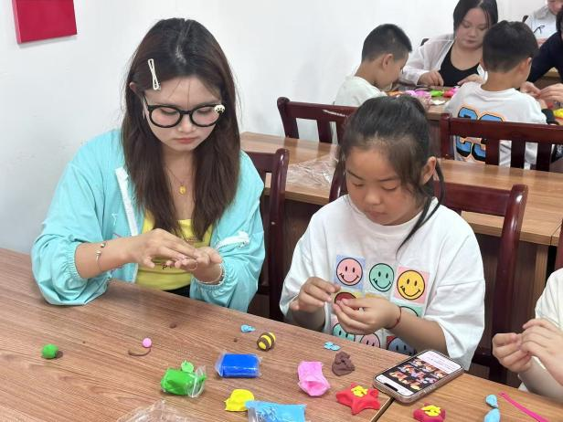 活动现场温馨而热烈。志愿者化身“红色艺术导师”,带领孩子们用黏土塑造五星红旗、党徽、天安门等立体作品。每完成一件作品,志愿者便结合党史故事进行讲解:从南湖红船的启航到天安门城楼的庄严宣告,革命历程随着黏土的延展融入童心。这种“一塑一讲”的互动模式,让红色教育从抽象说教转化为沉浸式体验。