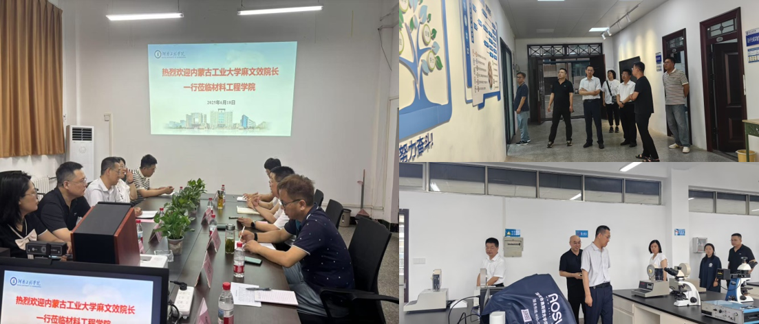 6月18日上午,内蒙古工业大学轻工与纺织学院院长麻文效一行6人莅临材料工程学院进行调研交流,材料工程学院党委书记辛长征、副院长杨柳及相关专业负责人参加。此次调研重点围绕功能材料专业建设展开深入座谈,并实地参观了学院相关实验室。